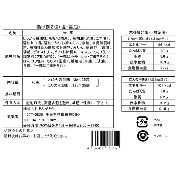 トップ > おかき・せんべい・和菓子 > 一斗缶サイズ 揚げ餅 2種 詰合せ 小袋70袋入り (塩・醤油 各35袋) 徳用