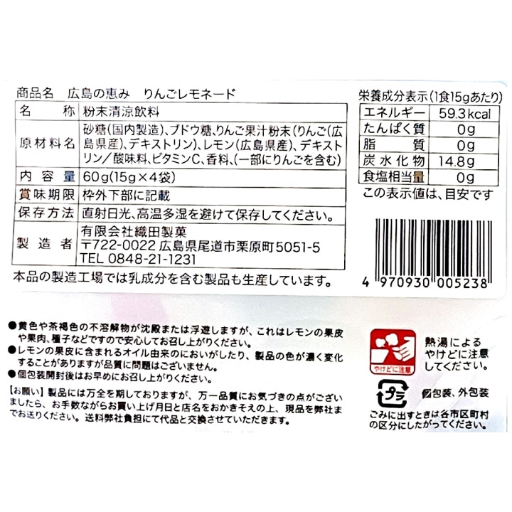 トップ > 食品・その他 > 粉末ドリンク 国産 広島の恵み りんごレモネード 60g(15g×4パック)×3袋 メール便(代引き不可)